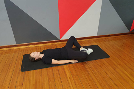 - Bend your knee of your leg that is on top and bring it towards your chest and place it on the floor